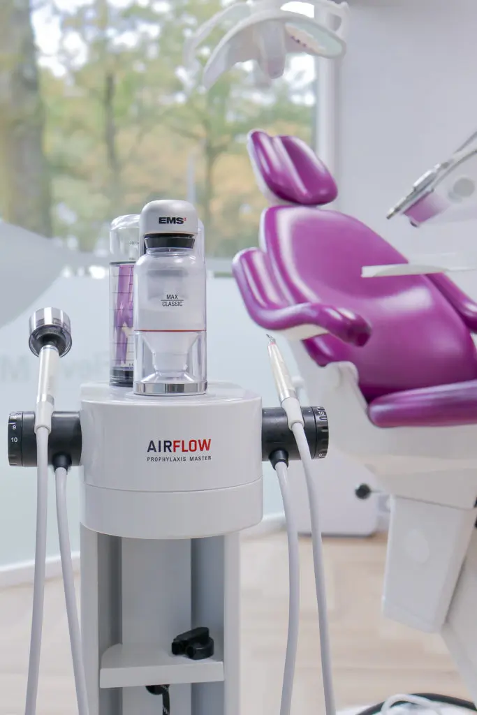 Fris, grondig en vrijwel pijnloos. Met de EMS Airflow® Prophylaxis Master reinigen we uw gebit met een fijne straal van warme lucht, water en erythritolpoeder.